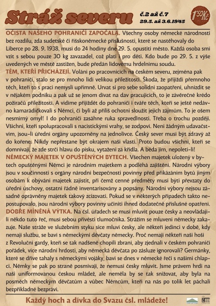 Č. 2-7: Co se psalo v novinách před 80. lety - Stráž severu č. 2-7: Jak se „čistilo“ naše pohraničí, kdy zasáhne ruka spravedlnosti, jak nakládat s majetkem Němců? A na úřadech se bude mluvit pouze česky.