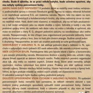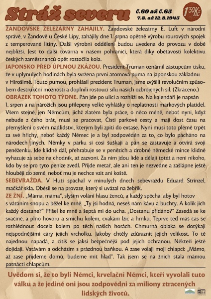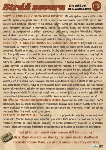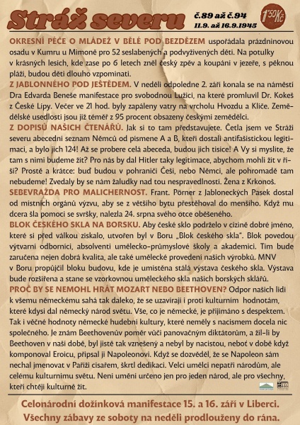 č. 8-13 Co se psalo v novinách před 80. lety – Stráž severu č. 8-13: Kdo nepracuje ať nejí, lidé už pocítili, že mezi „dobrými českými vlastenci“ z řad Revolučních gard jsou i rváči a zloději, v Jablonci nad Nisou spáchalo 60 Němců sebevraždu, a místo vyučování se budou sbírat léčivé byliny.