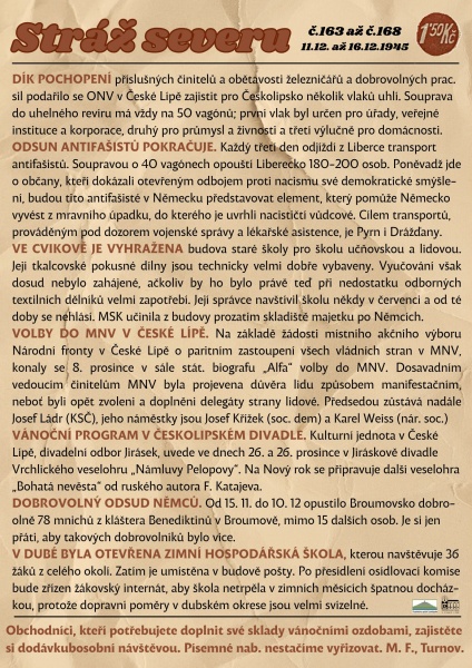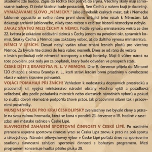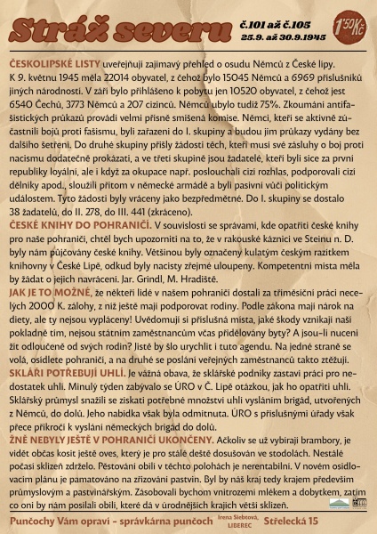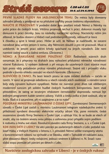 Co se psalo v novinách před 80. lety – Stráž severu č. 42-47: v České Lípě to začíná žít: otevírají se školy, obnovuje se Musejní spolek pro kraj českolipský a začíná se sportovat. Jablonné už není Německé, sňatky mezi Čechy a Němci jsou zakázané, Němci nesmí trhat borůvky a vojáci pomáhají při žních.