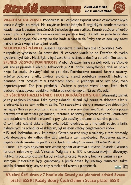 Co se psalo v novinách před 80. lety – Stráž severu č. 54-59: českoslovenští letci se vracejí z Anglie, zavřete kavárny a přijďte pomáhat při žních a smutné vyprávění o knihách z knihovny mimoňského zámku.
