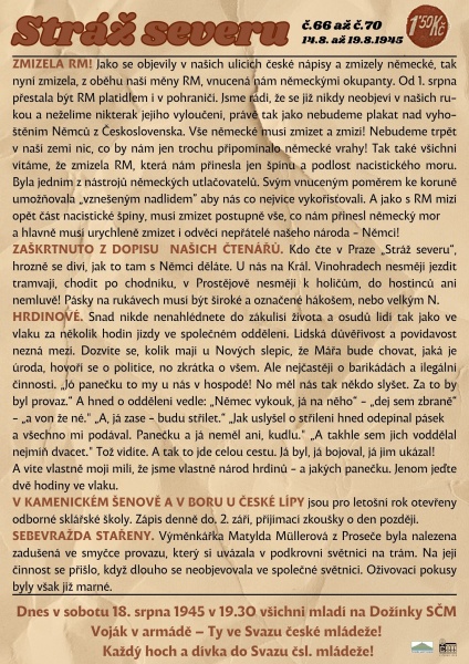 Co se psalo v novinách před 80. lety – Stráž severu č. 66-70: nebudeme plakat nad vyhoštěním Němců, v Praze se diví, jak jsme na Němce hodní, co Čech to hrdina, a zase sebevražda.