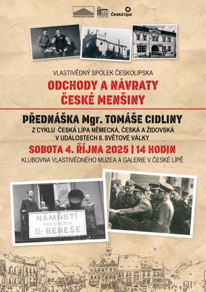 Na konci 30. let začali Židé naše město opouštět. Ti, co zde z různých důvodů zůstali, byli transportováni do Terezína a odtud do polských koncentračních táborů, kde jich většina zemřela. Po válce k nám přišlo nemnoho Židů z Podkarpatské Rusi. V následujících letech většina odešla do Izraele. Dnes o Židech v České Lípě nevíme, snad zde žije několik rodin, které se ale nikde nesdružují a nedávají o sobě vědět. Zůstalo po nich ale hodně stop: jejich domy, hřbitov a také kameny zmizelých, pamětní deska na místě zničené synagogy a zrušený nový židovský hřbitov, na jehož místě vznikl památník obětem pochodu smrti. Na tato místa se s JUDr. Tomášem Krausem vydáme v další akci našeho spolku.