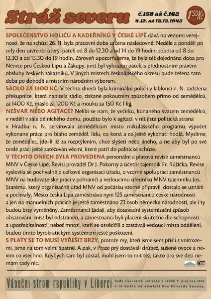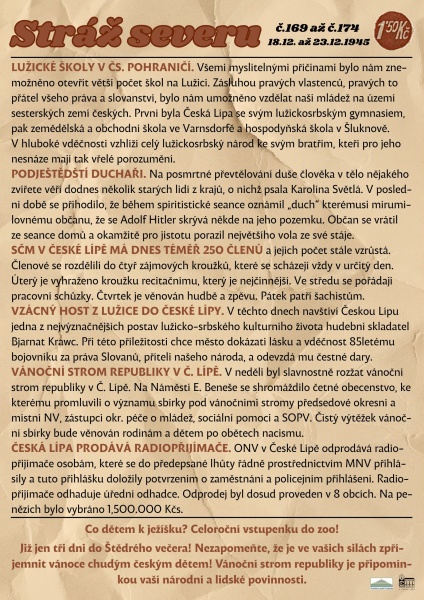 Co se psalo v novinách před 80 lety – Stráž severu č. 169-174: v České Lípě vzniklo Lužicko-srbské gymnázium, na náměstí byl rozsvícen vánoční strom republiky, a také do města přijel vzácný host, a na spiritistické seanci objevili převtěleného Hitlera.