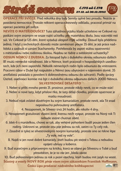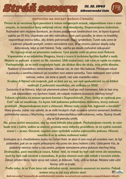 Co se psalo v novinách před 80 lety – Stráž severu Silvestrovské číslo: válečné útrapy skončily, a i když mnohým do smíchu moc nebylo, občas se při čtení rubriky Odpovědi na dotazy našich čtenářů zasmáli. Promítaly se v nich starosti, které museli lidé řešit: drahé potraviny, nedostatek uhlí, vztahy s Němci, a také mezi partnery. Ty ostatně platí dodnes. Přejeme Vám veselý Silvestr!